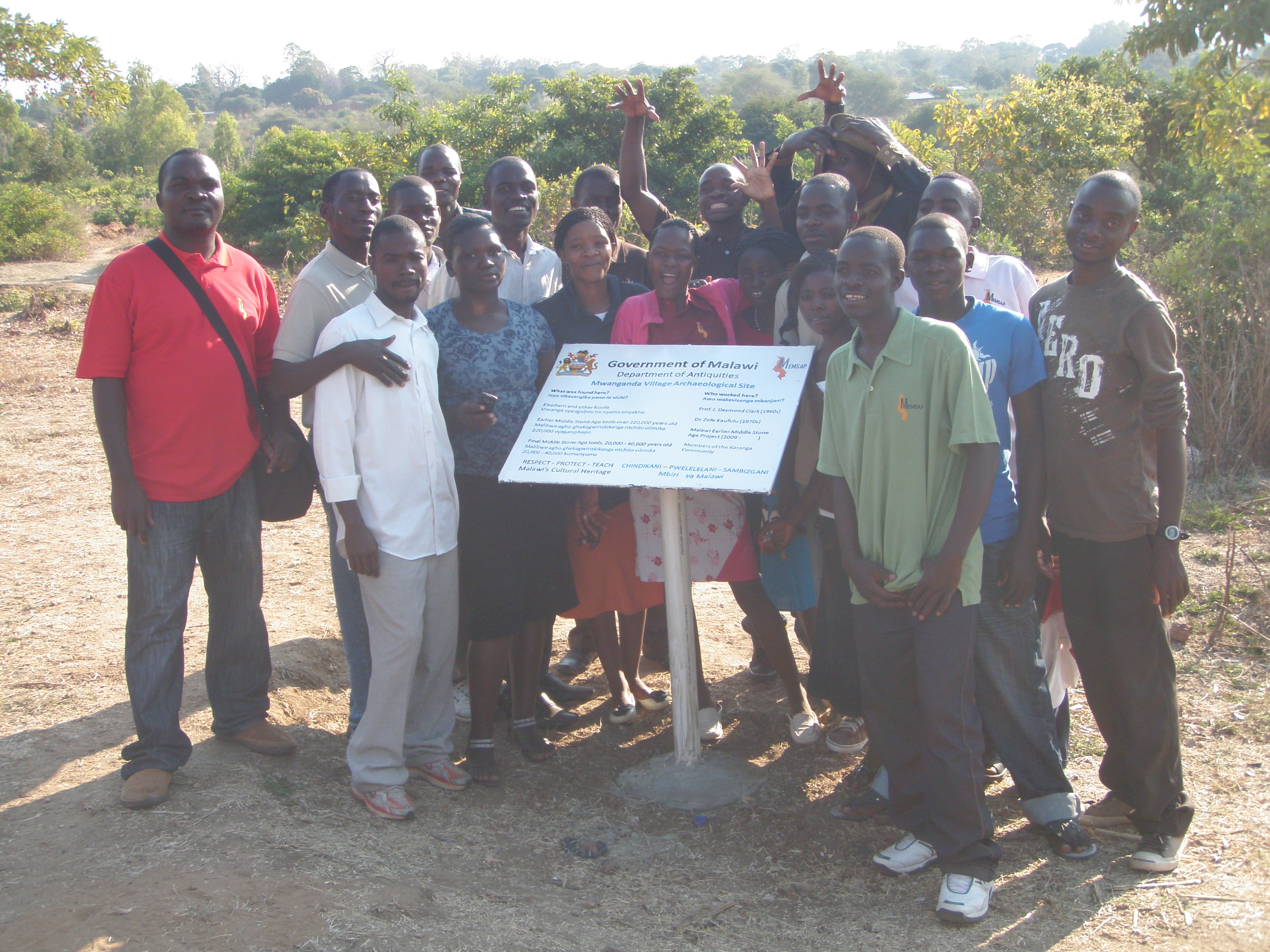 During the afternoon session, MEMSAP and guests proceeded to the archaeological site at Mwanganda Village where a new cultural heritage sign, designed by MEMSAP staff and painted by City University of New York doctoral candidate Sheila Nightingale, had just been cemented in place. The sign at Mwanganda Village feature dual language descriptions (in English and Chitumbuka) of what has been found at the site and who has worked there over the years. Mwanganda Village has a nearly 50 year history of archaeological research beginning with J. Desmond Clark and colleagues work during the early 1960s; MEMSAP continues to work there today with the help and support of local residents from Mwanganda village itself. Given the success of Archaeology Day this year, next year we hope to expand the event to a bigger audience and include local Karonga secondary school students among the guests so that they can experience first hand the opportunities for archaeological and paleontological research that are available in their own backyard.